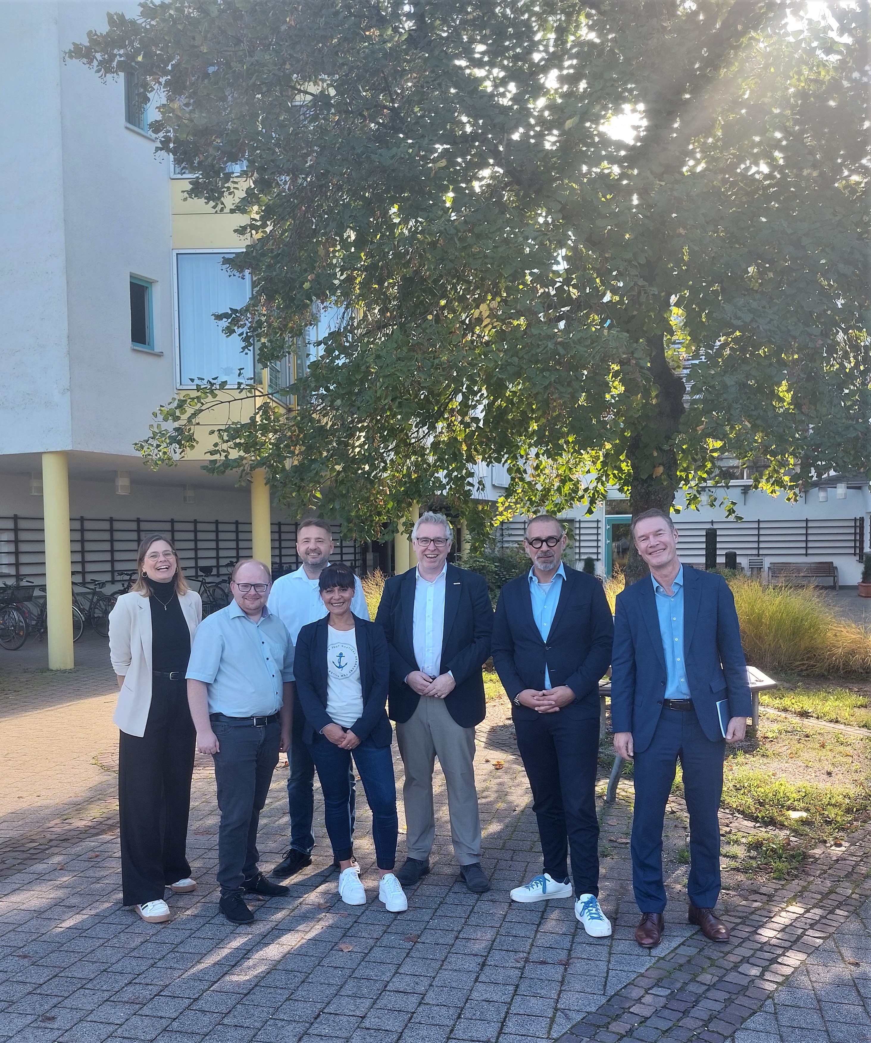 Der anschließende Ortwechsel zum Seniorenpflegeheim der Theodor-Fliedner-Stiftung bildete zugleich den thematischen Sprung hin zum Sozialen. Bei einem Rundgang durch das Gebäude und das weitläufige Gartenareal stellten Geschäftsführer Marcus Miertsch und Betriebsleiter Andreas Schulmeister gemeinsam mit ihrem Team das 1999 eröffnete hundert Plätze umfassende Seniorenpflegeheim, die aktuell im Umbau befindliche Tagespflegeplätze sowie die Anlage für Betreutes Wohnen vor. Bürgermeister Riehle war beeindruckt über die Aktivitäten der Einrichtung, die die Fliedner Stiftung für und mit den Bewohner*innen organisiert: „Die Fliedner Stiftung fördert das soziale Miteinander und die soziale Anbindung ihrer Bewohner*innen. Das wird hier gelebt und macht die Besonderheit des Hauses aus.“