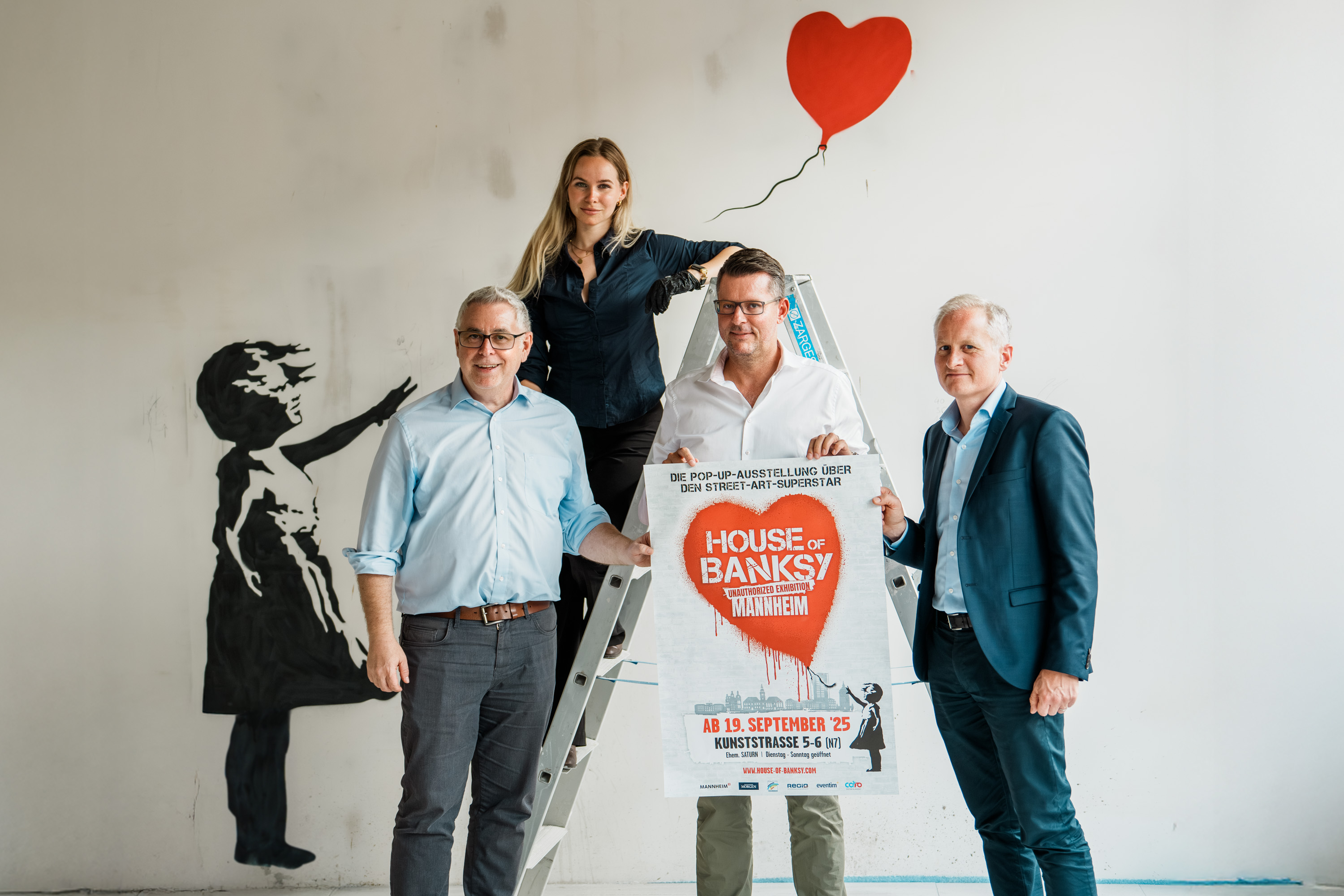 Es ist die umfangreichste und gefragteste Ausstellung über den Streetart-Superstar Banksy im europäischen Raum: Ab 19. September kommt sie unter dem Titel „House of Banksy Mannheim – An Unauthorized Exhibition“ erstmals in die Quadratestadt. In N 7, 6 (ehem. Saturn), inmitten der Mannheimer City, werden auf einer Fläche von gut 2.000 qm über 150 Motive des gefeierten Künstlers gezeigt werden. Bei einem Pressetermin stellten Kultur- und Wirtschaftsbürgermeister Thorsten Riehle, Produzent und Veranstalter Oliver Forster, CEO COFO Entertainment, und Kuratorin Virginia Jean das Konzept und die Idee hinter der Pop-Up-Ausstellung vor.