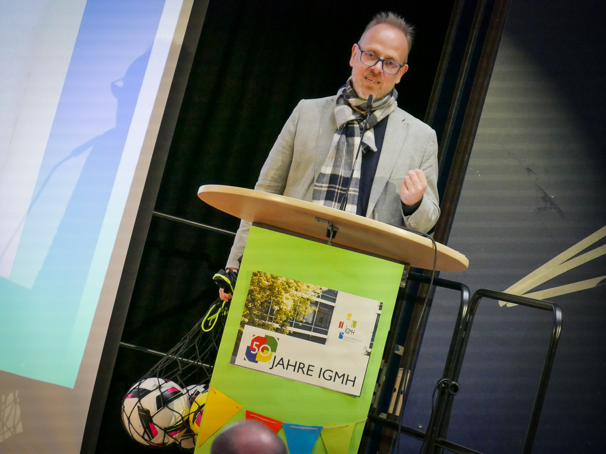 Die Stadt Mannheim investiert auch weiterhin in die Infrastruktur der Schule. Im kommenden Jahr soll die neue Dreifachsporthalle und die modernisierten Freisportanlagen eingeweiht werden. Mit Blick auf die neue Turnhalle brachte Bürgermeister Grunert zur Jubiläumsfeier drei neue Fußbälle mit und überreichte sie Rektor Rainer Mickelat als Gastgeschenk, dabei wünschte er der Schulgemeinschaft noch viele weitere sportliche und pädagogische Erfolge.