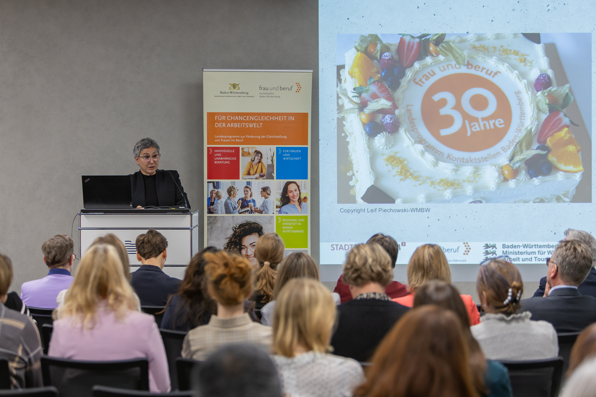 „Die Kontaktstelle Frau und Beruf setzt sich seit 30 Jahren dafür ein, dass Frauen gleichberechtigt am Erwerbsleben teilhaben und ihr Potential als Fachkräfte für die Wirtschaft entfalten können. Sie engagiert sich dafür, dass die Vereinbarkeit von Beruf und Sorgearbeit gelingt und unterstützt Migrantinnen beim Einstieg in den Arbeitsmarkt“, hob Bürgermeister Thorsten Riehle in seiner Rede die Rolle der Kontaktstelle hervor. „So leistet die Kontaktstelle einen wichtigen Beitrag zur Bekämpfung des Fachkräftemangels und wirkt präventiv gegen Altersarmut, von der Frauen nach wie vor häufiger betroffen sind als Männer.“