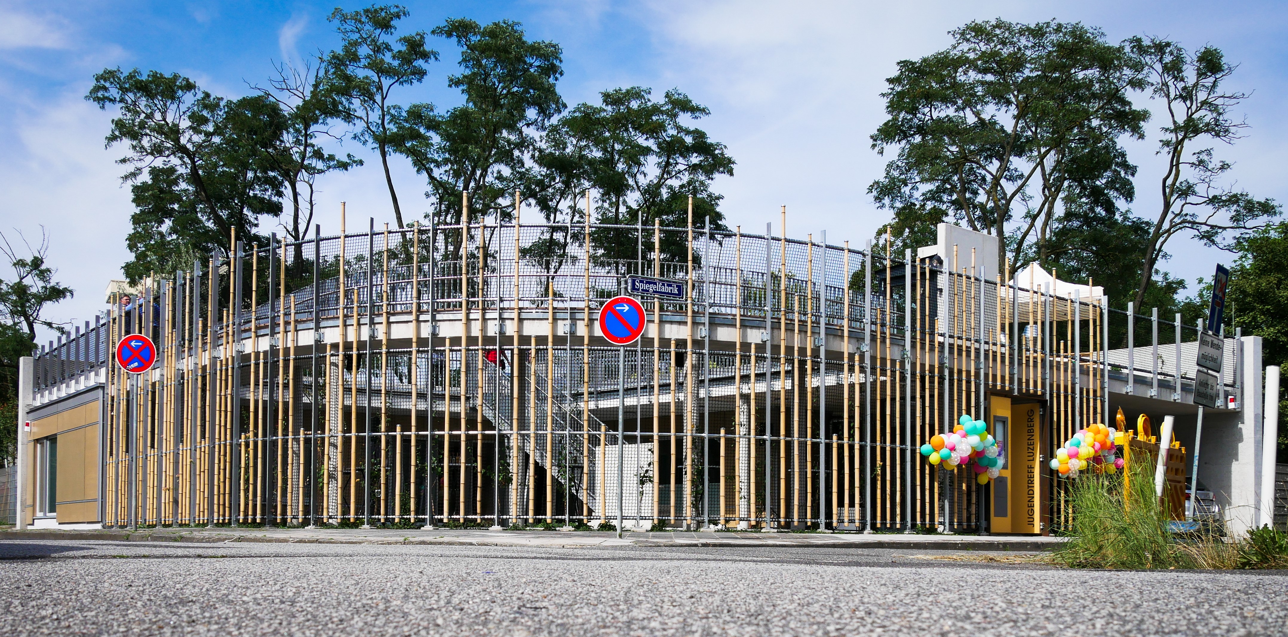 Für das rund 200 Quadratmeter große neue Gebäude wurde aus dem Freigelände des Kinderhauses Luzenberg in der Spiegelfabrik 25 ein Teil des Grundstücks herausgelöst und eine Rückwand aus Leichtbeton errichtet, an die sich das Gebäude anlehnt. So kann die unbebaute Fläche zusammenhängend als Innenhof genutzt werden und dient unter anderem als Spielfläche. Das Dach wurde über eine Treppe erschlossen und steht als zusätzliche Freifläche für diverse Freizeitaktivitäten oder als Ort zum Ausruhen zur Verfügung. Die Dachfläche ist teilweise bereits begrünt. Ein erweiterter, balkonartiger Umlauf auf dem Dach ermöglicht den Ausblick von oben auf den Innenhof.