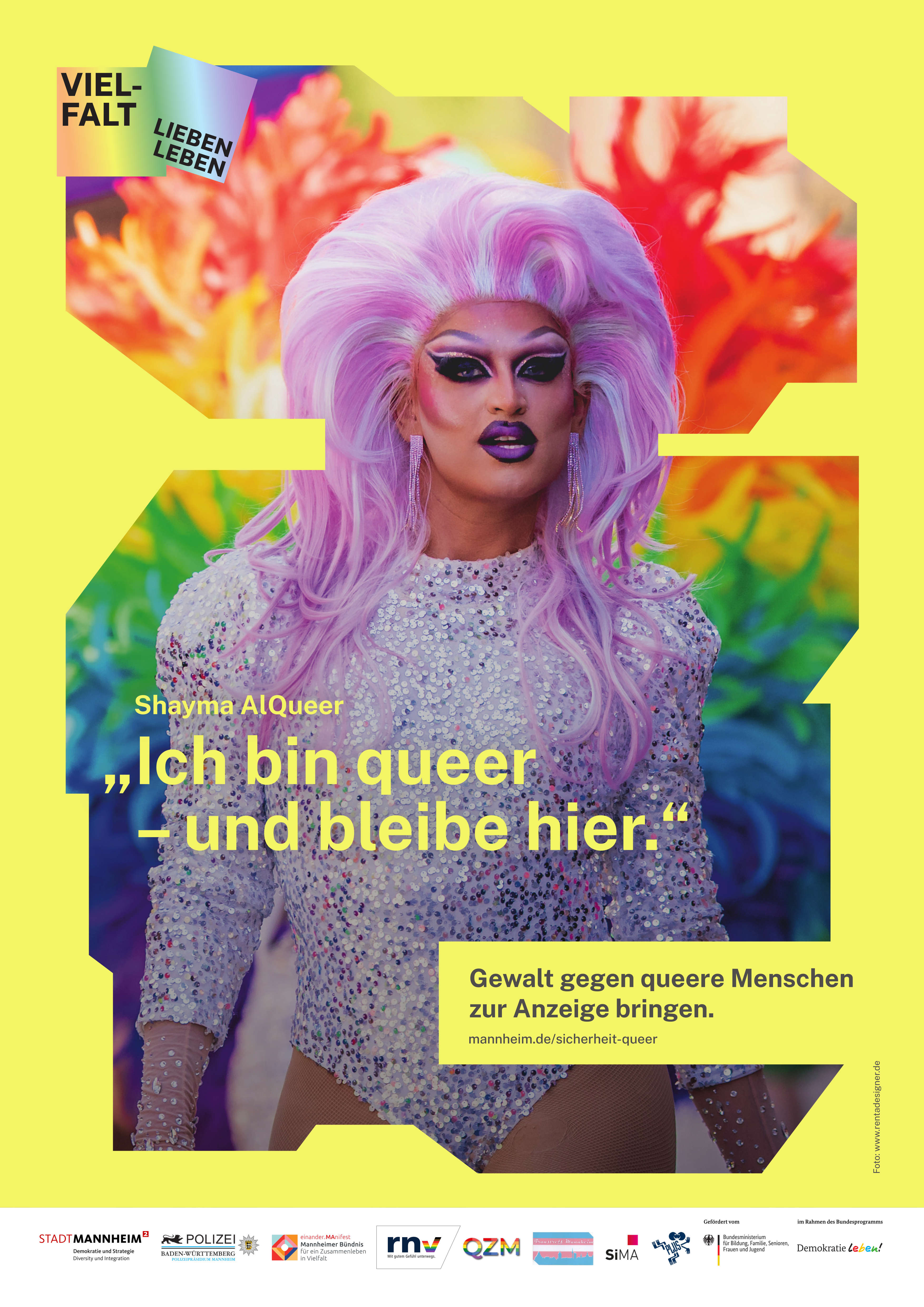 Die zentralen Themen für die Kampagne wurden in einem partizipativen Workshop mit Fachkräften des städtischen Fachbereichs Sicherheit und Ordnung, der Polizei sowie mit ehrenamtlich Aktiven aus der queeren Community erarbeitet. Als konkrete Hilfestellung weisen alle Plakate darauf hin, Gewalt gegen queere Menschen zur Anzeige bringen. Auch auf die drei konkreten Möglichkeiten, eine Anzeige zu machen, wird hingewiesen: per Notruf 110, auf dem nächsten Polizeirevier oder über die Onlinewache (www.polizei-bw.de/onlinewache). Diese und weitere Anlaufstellen sind zudem auf der Webseite www.mannheim.de/sicherheit-queer zu finden.