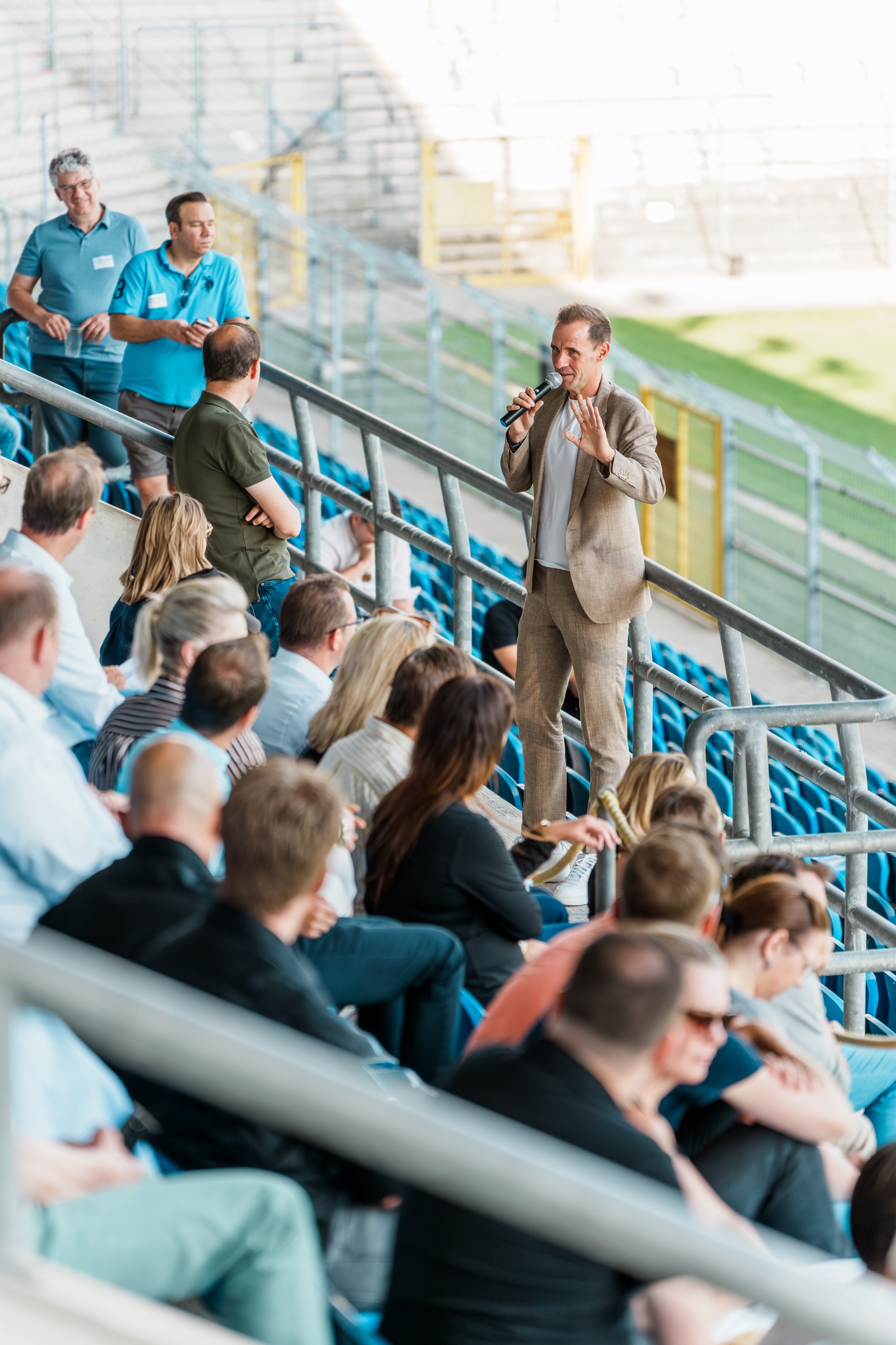 Krisen gehören längst zum Geschäftsalltag – entscheidend ist, wie man mit ihnen umgeht. „Wie Widerstandskraft zum Erfolgsfaktor werden kann und welche Perspektiven es zu entdecken gilt, darüber diskutierten Fachleute, Unternehmerinnen und Unternehmer sowie regionale Akteurinnen und Akteure beim Mannheimer Gewerbeforum 2025, das der Fachbereich für Wirtschafts- und Strukturförderung der Stadt Mannheim erstmalig in Kooperation mit dem SV Waldhof Mannheim veranstaltete. Zur Premiere des neuen Formats kamen mehr als 400 Teilnehmende in das Carl-Benz-Stadion. Flankiert wurde das Programm von einem "Marktplatz", auf dem sich rund zwei Dutzend Institutionen und Initiativen aus der Region mit ihren Dienstleistungen und Ideen präsentierten. Der Veranstaltung vorausgegangen waren zahlreiche kleinere stadtteilbezogene Gewerbeforen – und die Erkenntnis, dass viele Themen, die kleine und mittlere Unternehmen bewegen, unabhängig von ihrem Standort sehr ähnlich sind und ein Bedarf an Vernetzung und Wissenstransfer besteht. In sommerlicher Atmosphäre, musikalisch begleitet von „Rolf Stahlhofen & Band“ und bei Imbiss und Getränken des SV Waldhof bot das Gewerbeforum den Teilnehmenden Gelegenheit zum Netzwerken und Austausch.