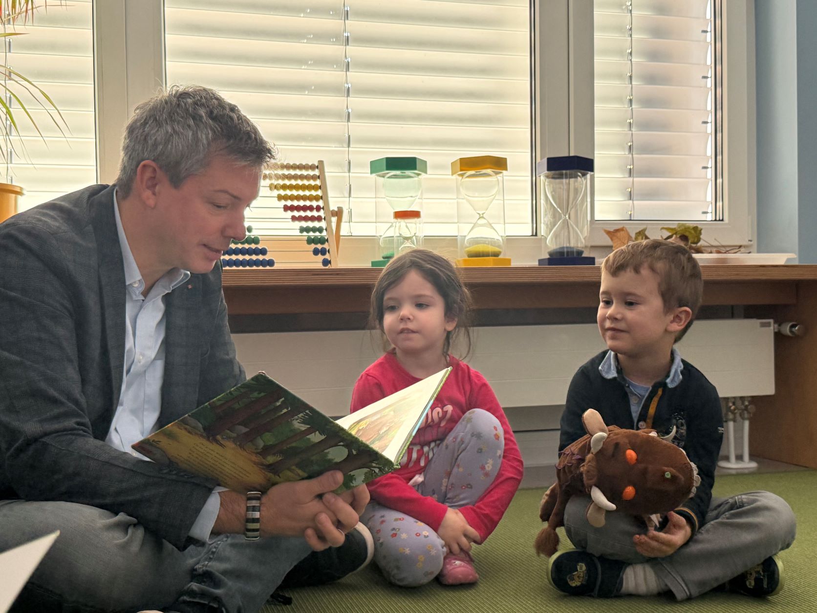 Für einen besonderen Moment sorgte anschließend Andreas Müller: Er trug den Kinderbuchklassiker „Der Grüffelo“ von Julia Donaldson nicht nur auf Hochdeutsch vor – sondern auch auf Schwäbisch. Die humorvolle Dialektversion brachte die Kinder zum Lachen und zeigte eindrucksvoll, wie vielfältig und lebendig Sprache sein kann. Ergänzt wurden die Lesungen durch Eltern, die diese Geschichten auf Arabisch und Englisch vortrugen und so den mehrsprachigen Ansatz des ElKiZ unterstrichen.