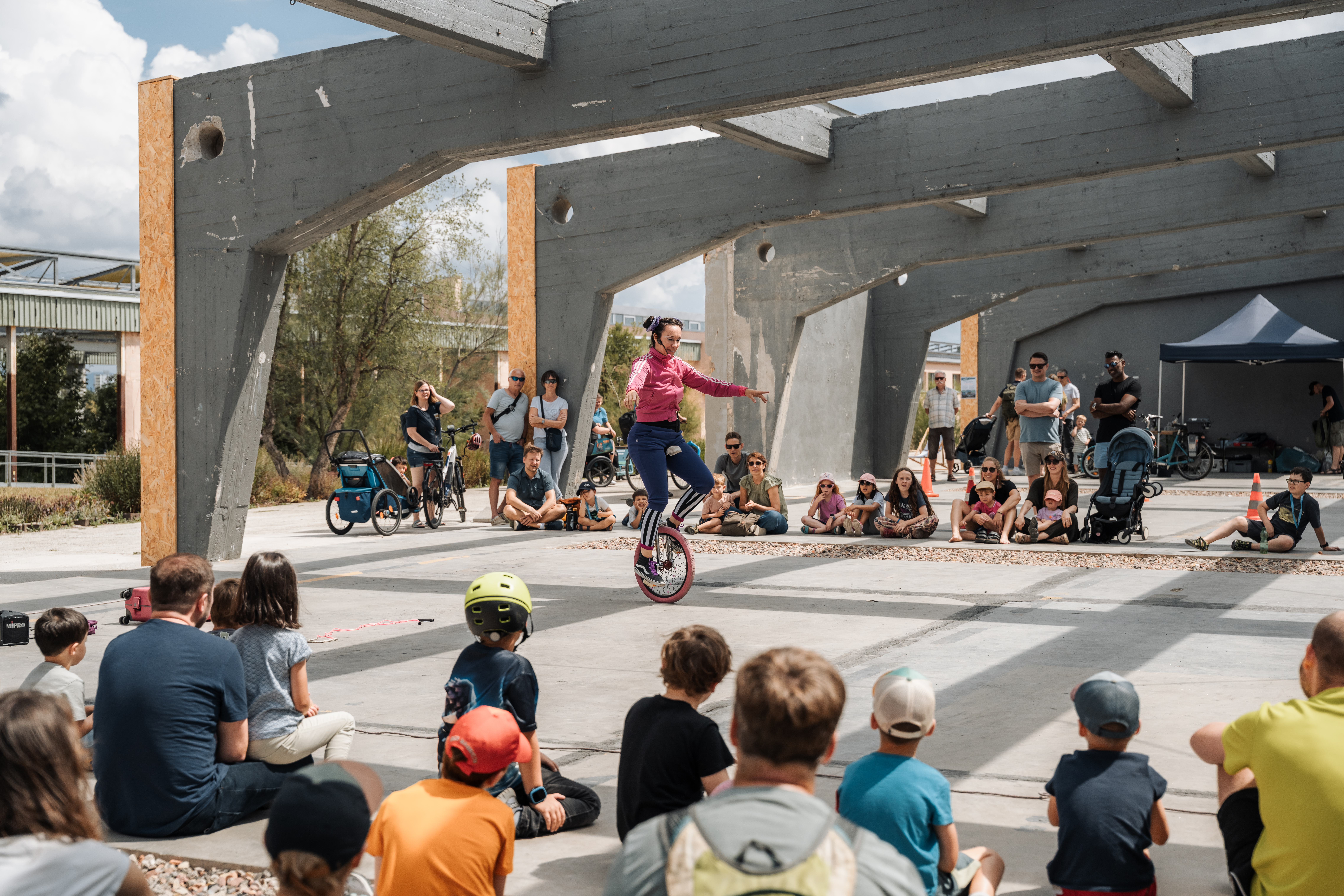 Ein echter Hingucker waren die Fahrradkünstlerinnen und -künstler mit ihren Shows auf ein, zwei oder mehr Rädern. Die beliebte BMX-Show, bei der einige der besten BMX-Talente Deutschlands auf ihrer Luftkissenlandung spektakuläre Tricks präsentierten, durfte natürlich nicht fehlen. Im Anschluss an die Shows hatte das Publikum selbst die Möglichkeit, an Workshops teilzunehmen und erste Tricks zu üben – Leihräder in verschiedenen Größen und diverse Rampen standen dafür bereit. Die Bike Brothers zeigten spektakuläre Sprünge und atemberaubende Stunts in ihrer Trial-Bike-Show. Ina Queiss aus dem Cycling Circus führte in ihrer Bikerina-Show außergewöhnliche Akrobatik auf dem Rad vor.