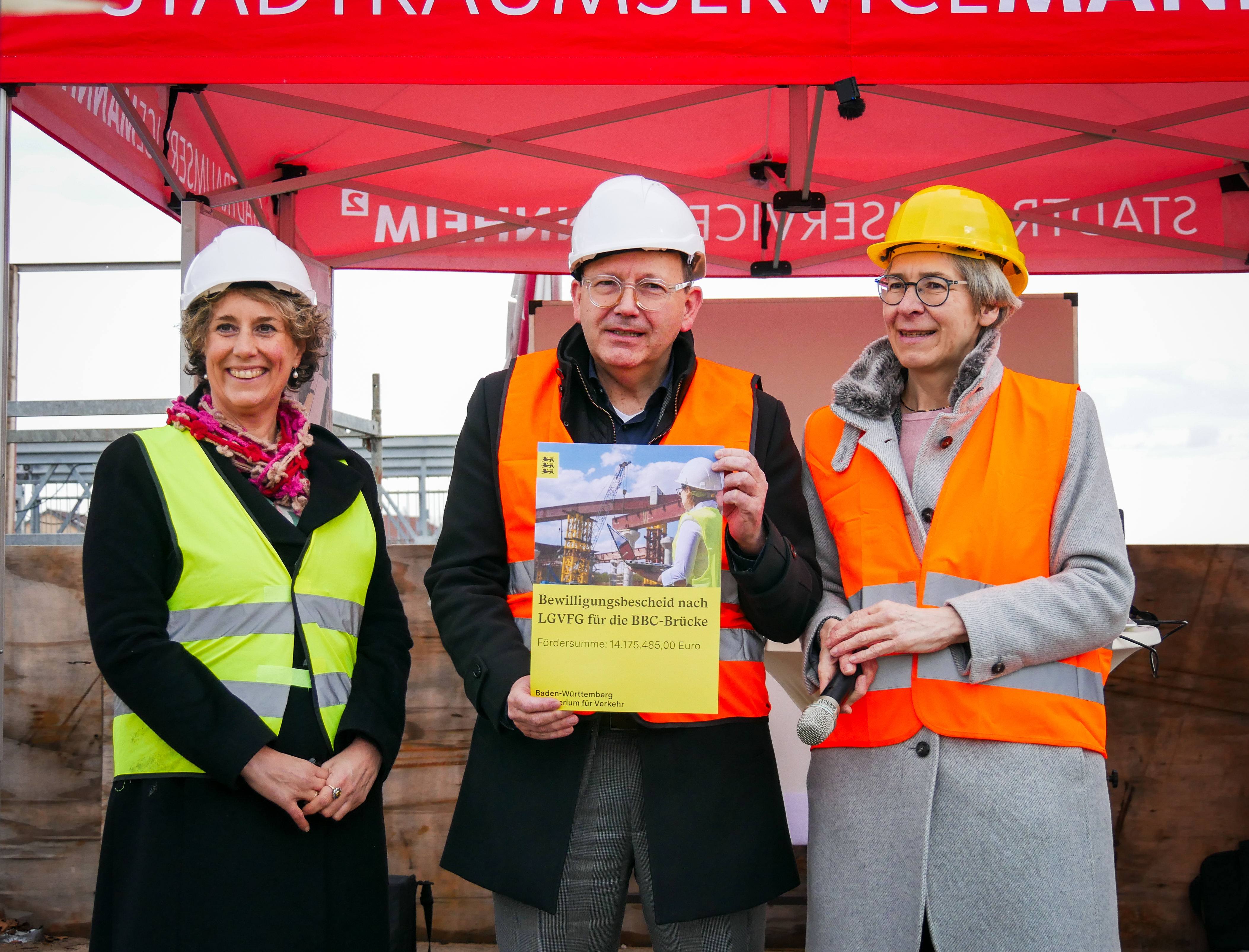 „Die BBC-Brücke ist Teil der Bundesstraße 38 – einer Hauptverkehrsachse für die Erschließung der Mannheimer Innenstadt. Sie ist insbesondere für die Menschen und die Wirtschaft im Mannheimer Norden von großer Bedeutung. Darum muss diese zentrale Brücke über die stark frequentierte und international bedeutende Riedbahn zügig erneuert werden und während der Arbeiten möglichst immer nutzbar bleiben“, sagte Oberbürgermeister Christian Specht und betonte: „Dafür müssen wir nach derzeitigem Stand rund 33 Millionen Euro investieren. Das zeigt deutlich, dass Städte wie Mannheim für die Modernisierung ihrer vielen Brücken und teuren Bauten auf die Unterstützung von Land und Bund angewiesen sind. Das Land Baden-Württemberg hat die enorme Bedeutung der BBC-Brücke für Mannheim und die Region erkannt und fördert den Neubau mit 14,2 Millionen Euro. Dafür bedanke ich mich heute ausdrücklich.“