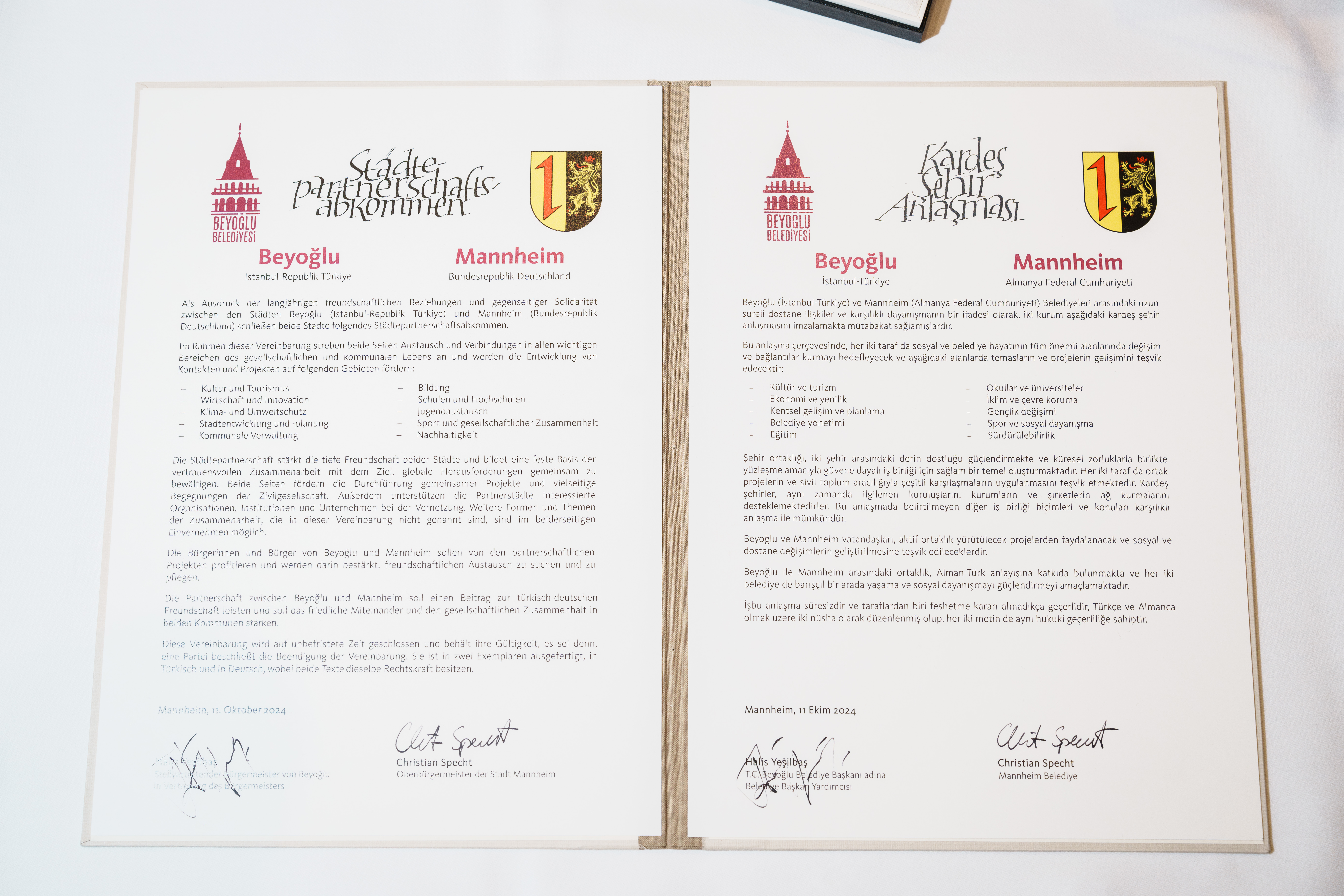 Die Stadt Mannheim und der Istanbuler Stadtbezirk Beyoğlu haben am Freitag ihre langjährige Freundschaft zu einer vollumfänglichen Städtepartnerschaft erhoben. Bereits im vergangenen Jahr hatte der Mannheimer Gemeinderat die Aufwertung der Beziehungen zu einer Städtepartnerschaft beschlossen, nun folgte die zeremonielle Unterzeichnung des Partnerschaftsvertrags durch Oberbürgermeister Christian Specht und den stellvertretenden Bürgermeister von Beyoğlu, Halis Yeşilbaş. Die Feierlichkeiten mit circa 50 geladenen Gästen fanden in der Neuen Parkmitte des Luisenparks statt.