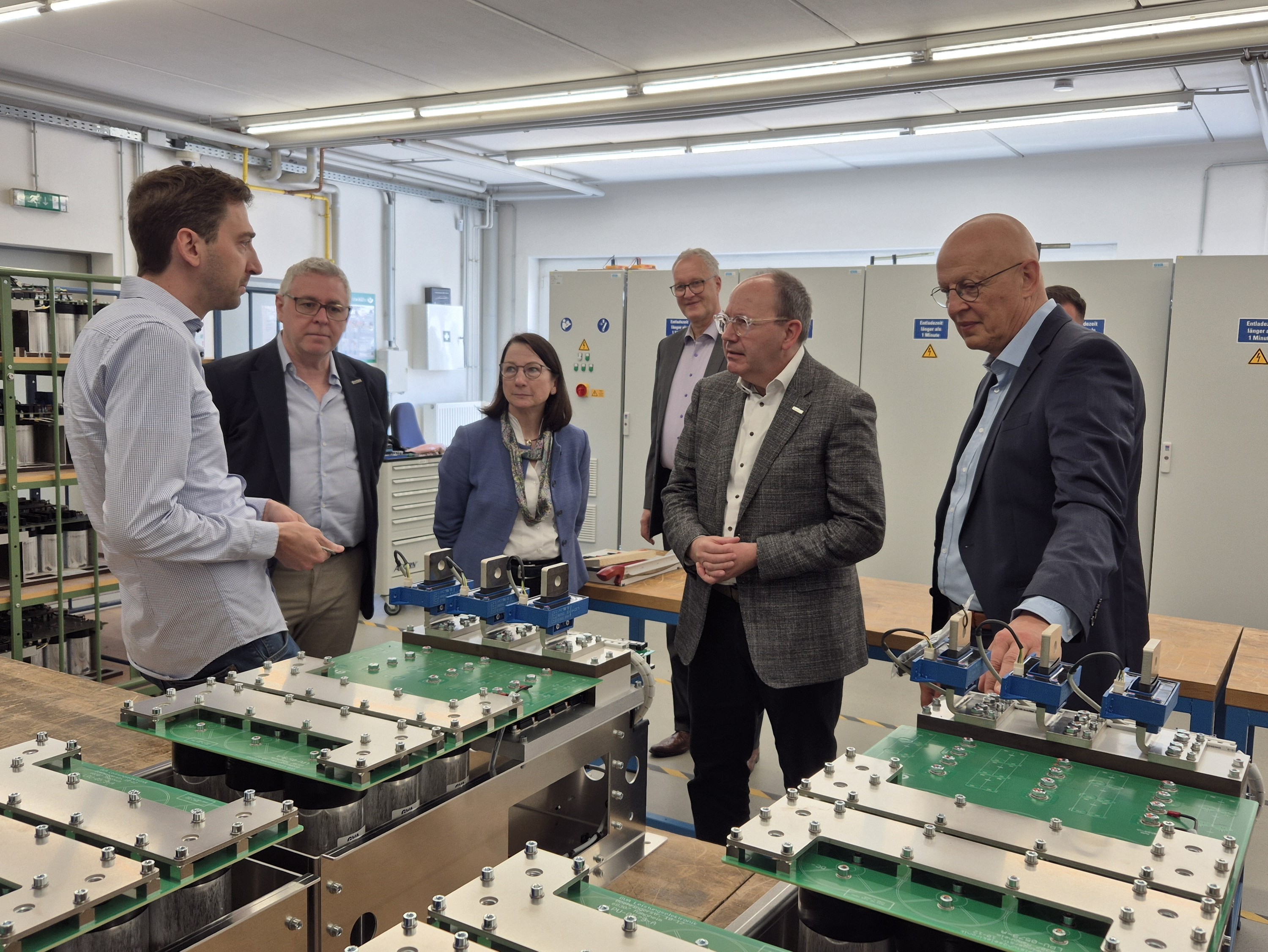 Oberbürgermeister Christian Specht hat kürzlich mit einer städtischen Delegation das mittelständische Unternehmen GVA Leistungselektronik GmbH in Mannheim besucht. Begleitet wurde er von Wirtschaftsbürgermeister Thorsten Riehle, Burak Bas, Local Green Deal Manager bei der Stadt Mannheim, Christiane Ram, Leiterin des Fachbereichs für Wirtschafts- und Strukturförderung, und Michael Müller, Firmenbetreuer bei der Wirtschaftsförderung.