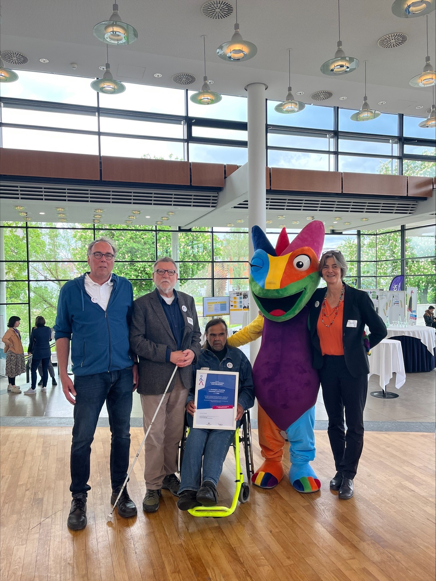Verkehrsminister Winfried Hermann MdL hat den Preis, der zum ersten Mal verliehen wurde, auf der Fußverkehrskonferenz in Ulm an den Badischen Blinden- und Sehbehindertenverein V.m.K. (BBSV), die Arbeitsgemeinschaft Barrierefreiheit Rhein-Neckar e.V. und den Gehörlosenverein Mannheim 1891 e.V. übergeben. Diese haben die Kampagne gemeinsam entwickelt, um für die Herausforderungen für Menschen mit und ohne Behinderungen im öffentlichen Raum zu sensibilisieren. Unterstützt werden sie dabei auch durch die Beauftragte für die Belange von Menschen mit Behinderungen der Stadt Mannheim, Ursula Frenz. Ob abgesenkte Bordsteine, die zugeparkt sind, oder Hindernisse, die das Blindenleitsystem blockieren: Die Kampagne leistet wichtige Aufklärungsarbeit, um das Bewusstsein für vermeidbare Hürden im öffentlichen Raum zu schärfen. Dabei hilft auch das sympathische Chamäleon-Maskottchen Chämy, das dank seiner Fähigkeit zur fast kompletten Rundum-Sicht überall im öffentlichen Raum mögliche Hindernisse erkennt und darauf mit einem charmanten Augenzwinkern aufmerksam macht.