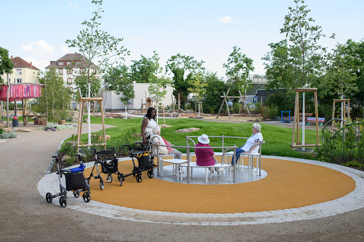 Kindern bietet der Mehrgenerationenspielplatz Attraktionen wie einen Wasserspielbereich, Trampoline, herausfordernde Kletter-, Rutsch- und Balancierangebote, einen Kleinkindbereich, eine Rollstuhl-Wippe und eine Nestschaukel, die auch für Menschen mit Behinderung sehr gut geeignet ist. Jugendliche dürften sich besonders über das Spielfeld für Ballspiele und über den Hängematten-Bereich freuen. Eine Boule-Bahn lädt zu geselligen Spielen ein und für Menschen ab 14 Jahren gibt es Fitness- und Calisthenics-Bereiche. Hier sind die Geräte zum Teil vom Rollstuhl aus nutzbar. Zusätzlich gibt es ein barrierefreies Karussell für Kinder und Erwachsene und ein Holzpodest, das als Bühne für Veranstaltungen genutzt werden kann. Das Ganze ist integriert in eine parkähnliche Anlage mit 36 neu gepflanzten Bäumen. Für Hunde gibt es gleich nebenan in der Karlsruher Straße eine Wiese.