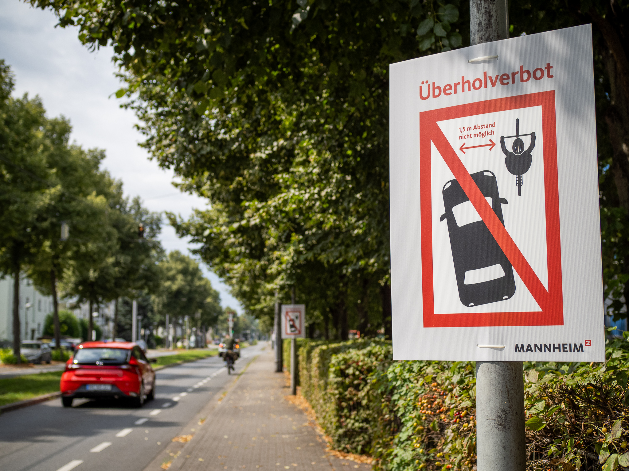 Für mehr Sicherheit im Radverkehr initiiert die Stadt Mannheim eine Aufmerksamkeitskampagne und appelliert an alle Autofahrer auf Rücksichtnahme: Ab sofort weisen Plakate auf das Überholverbot, das hier gilt, hin.