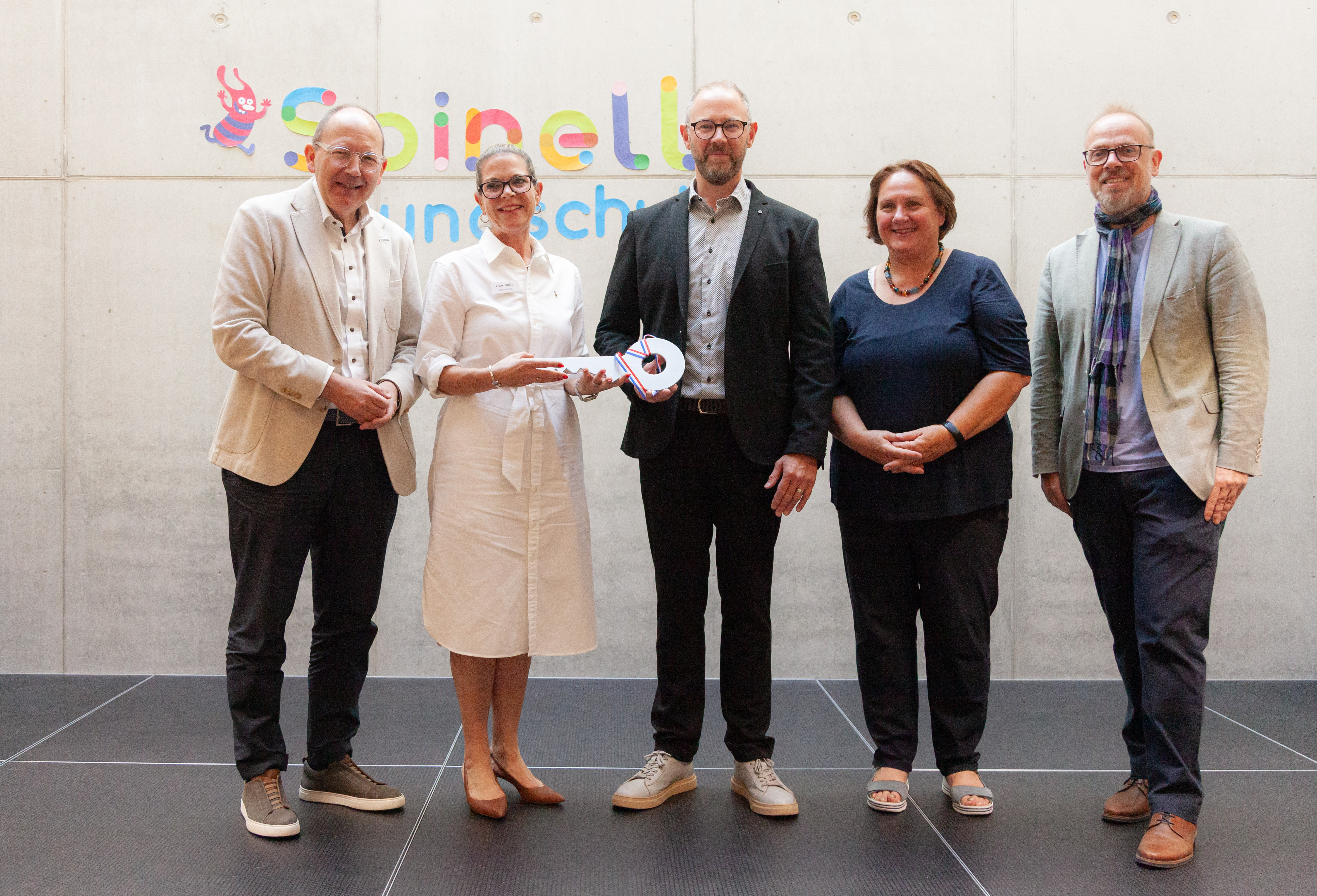 Mit einem feierlichen Festakt ist heute (10.07.2025) die neue Spinelli-Grundschule offiziell eingeweiht worden. In Anwesenheit der baden-württembergischen Kultusministerin Theresa Schopper, Oberbürgermeister Christian Specht, Bildungsbürgermeister Dirk Grunert sowie dem Geschäftsführer der Bau- und Betriebsservice GmbH (BBS) Peter Doberass wurde symbolisch der Schlüssel an Schulleiterin Sabine Stechl übergeben. An dem Festakt in der Mensa des Schulgebäudes nahmen weitere 120 geladene Gäste teil.