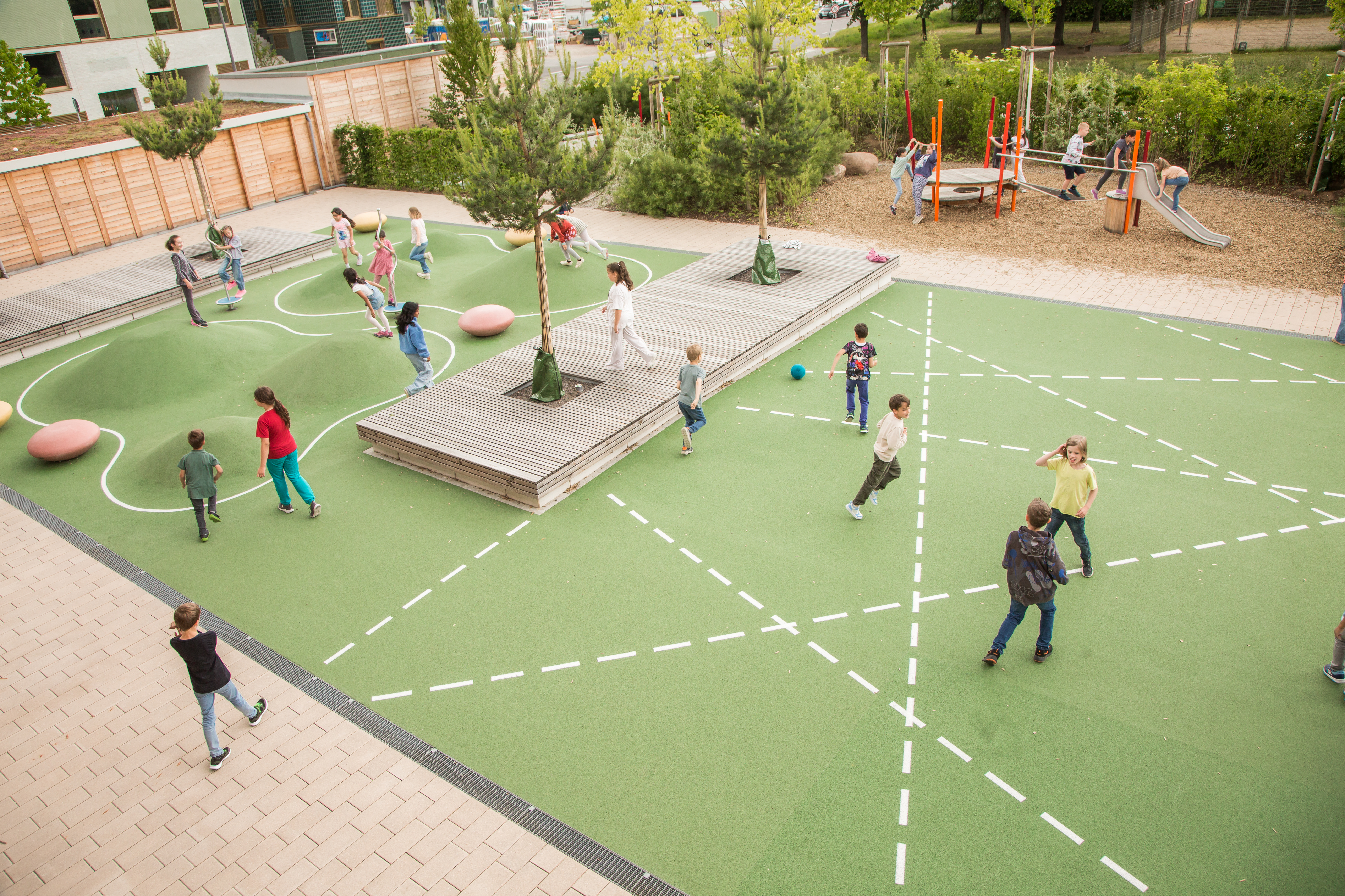 Der Schulhof wurde als bunter Spielraum gestaltet: Am Rand des ehemaligen BUGA Geländes ist ein Ort für Sport und Spaß mit vielen Spielangeboten entstanden. Im abwechslungsreichen Pausenhof gibt es Sitzmöglichkeiten, Rückzugsbereiche und ein „grünes Klassenzimmer“. Der umlaufende Fluchtbalkon ist als „Schattenspender“ begrünt, ebenso wie das Dach. Damit fügt sich das Gebäude nahtlos in das Modellquartier Spinelli ein. Erstmals in Mannheim wird hier ein gesamtes Quartier von der Deutschen Gesellschaft für Nachhaltiges Bauen (DGNB) zertifiziert.