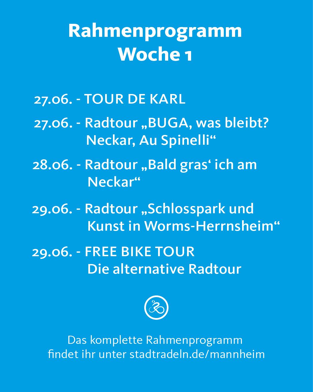 Ein vielfältiges Rahmenprogramm begleitet die Aktion, darunter der Firmenradtag Rhein-Neckar, geführte Radtouren, Stadtführungen und ein Reisevortrag über Radreisen in Deutschland.