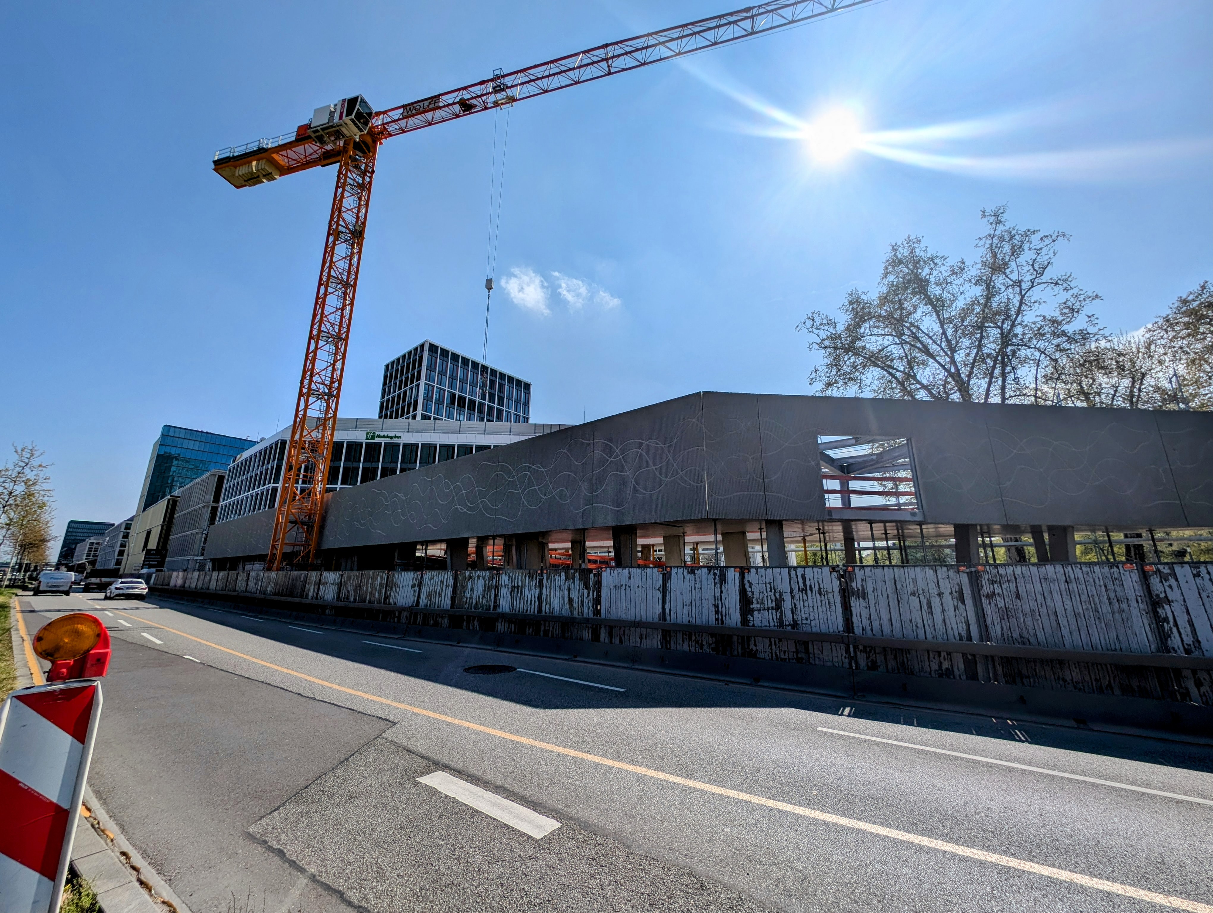 Nachdem die Stahlkonstruktion der obersten Ebene, wo das Fahrradparken verortet sein wird, bereits Anfang April fertig gestellt wurde, wird als nächster Schritt mit dem Dach begonnen. Außerdem erhält das Gebäude auf der Lindenhof-Seite im Bereich Fahrradparken eine Profilit-Verglasung. Ebenfalls aus Profilit-Glas, teilweise integriert ins Zugangsgebäude, entsteht entlang der Helmut-Kohl-Allee eine halbtransparente Lärmschutzwand als Abschottung zum Lindenhofplatz.