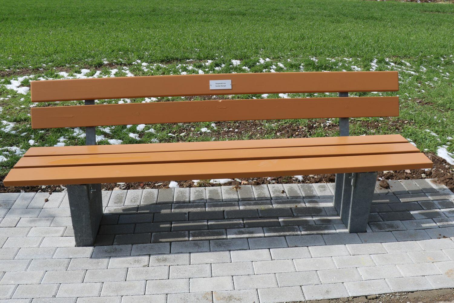 - Schild mit Widmung: Ein Metallschild mit einer von Ihnen gewählten Widmung an Ihrer Bank bzw Ihrem Baum. Bei Bäumen wird das Schild an dem Dreibock angebracht, der Ihren Baum in den ersten Jahren stützt. Nach ca. drei Jahren werden der Dreibock und das Schild entfernt.