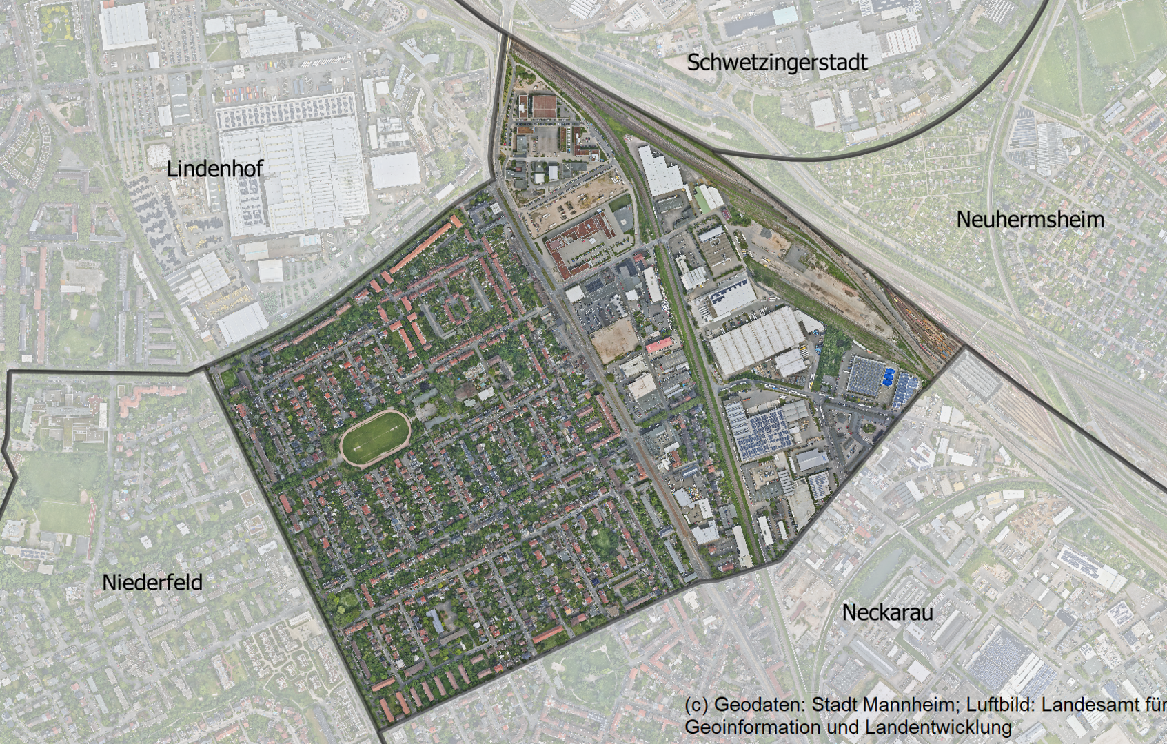 • Größe ca. 1,3 km² - entspricht etwa 190 Fußballfeldern und macht etwa 0,9 Prozent der Gesamtfläche Mannheims aus. 72 Prozent der Fläche des Stadtteils sind versiegelt.