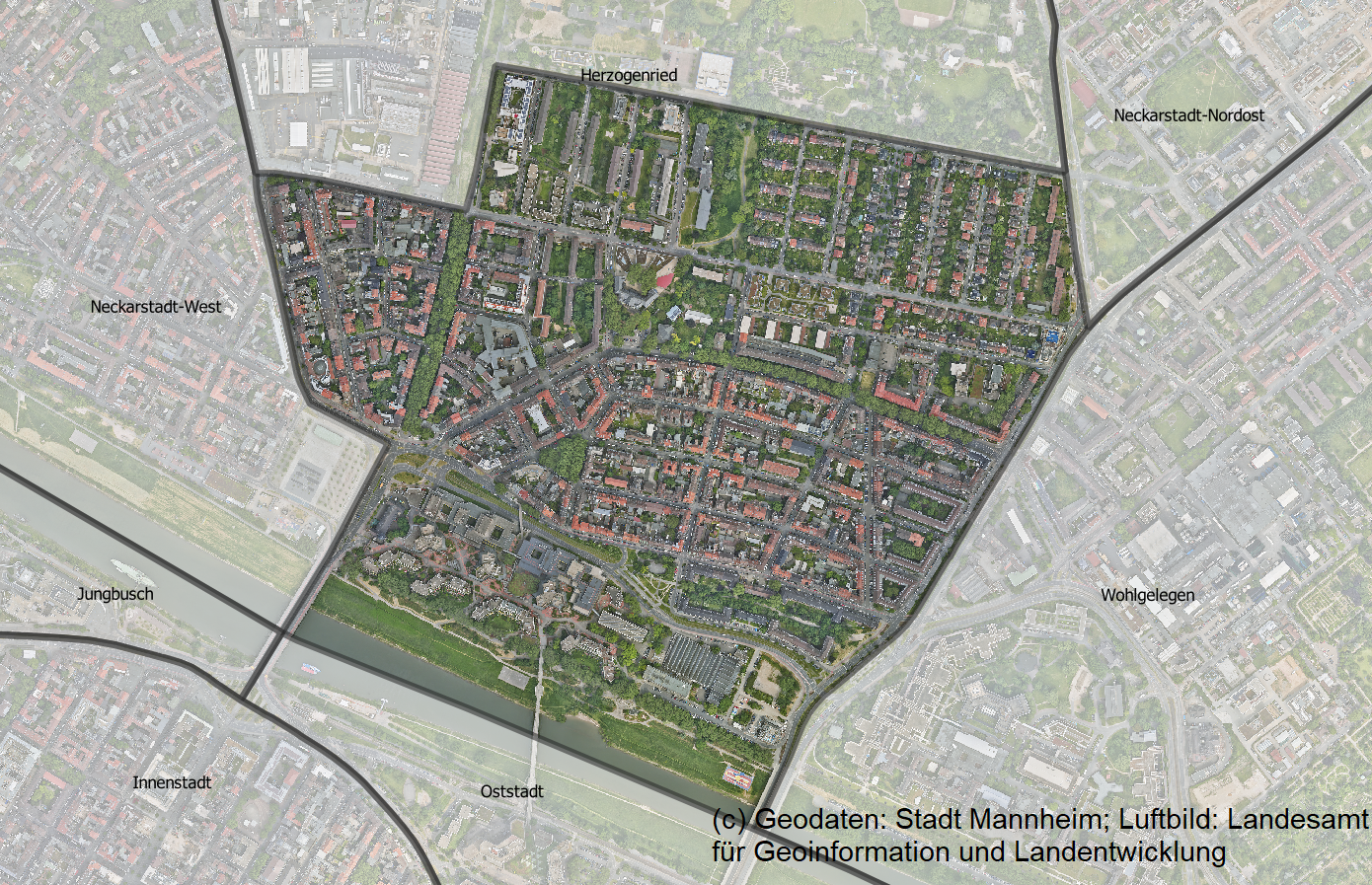 - bildet zusammen mit den Stadtteilen Herzogenried, Neckarstadt-Nordost und Wohlgelegen den gleichnamigen Stadtbezirk Neckarstadt-Ost (-> Der Stadtteil Neckarstadt-Ost im Stadtplan)