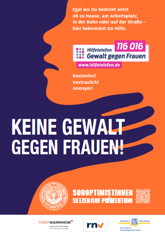 Mit großartiger Unterstützung der Gleichstellungsbeauftragten der Stadt Mannheim und der Rhein-Neckar-Verkehr GmbH (rnv) haben in diesem Jahr die 12 Clubs der Metropolregion eine gemeinsame Plakataktion in Straßenbahnen und Bussen der rnv gestartet. Hier wird auf die bundesweite Hilfetelefonnummer zu Gewalt gegen Frauen „116016“ verwiesen. Das Hilfstelefon berät zu allen Formen der Gewalt, darunter Partnerschaftsgewalt, Mobbing, Stalking, Zwangsverheiratung, Vergewaltigung und Menschenhandel – anonym, kostenlos und in 18 Fremdsprachen. Die Telefonnummer ist täglich (auch an Wochenenden und Feiertagen) rund um die Uhr erreichbar. Unter https://www.hilfetelefon.de/ gibt es auch eine Online-Beratung.
