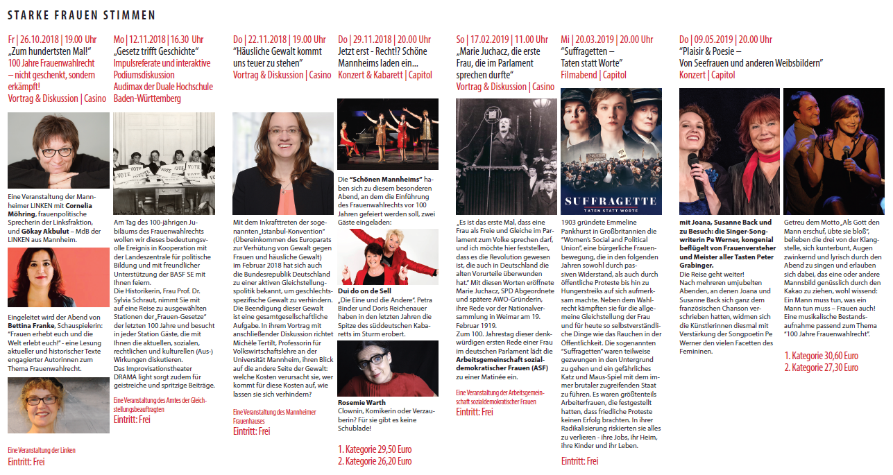 Am Tag des 100-jährigen Jubiläums der Einführung des Frauenwahlrechts wollen wir dieses bedeutungsvolle Ereignis in Kooperation mit der Landeszentrale für politische Bildung, dem Capitol und mit freundlicher Unterstützung der BASF SE mit Ihnen feiern. Anhand der Gesetze, die in den letzten 100 Jahren zum Thema Gleichstellung von Frauen und Männern verabschiedet wurden, sollen folgende Fragen kritisch diskutiert werden: