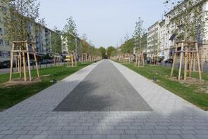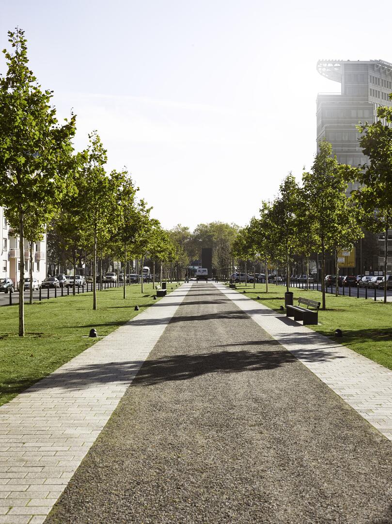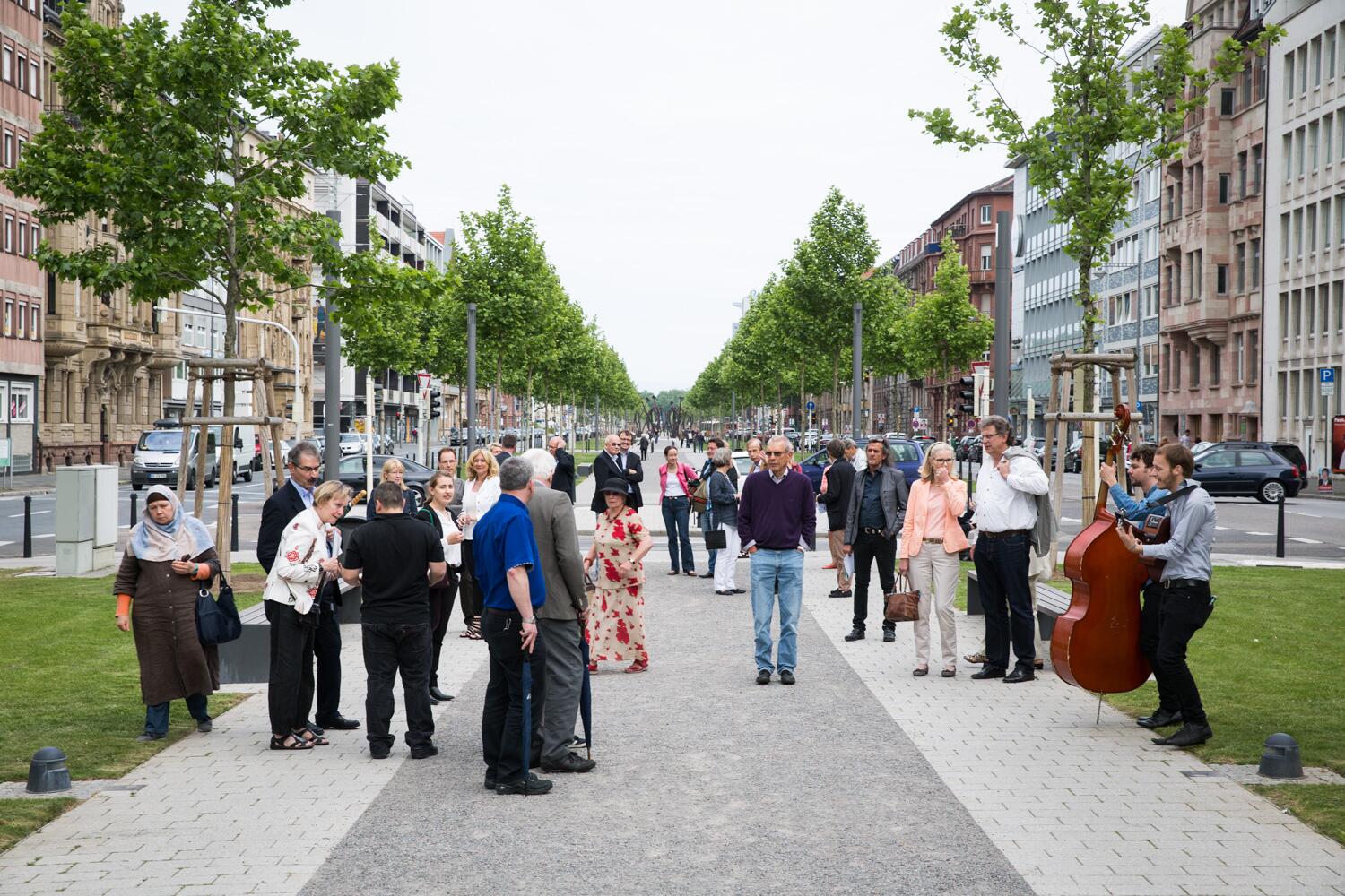 Die neue Flaniermeile führt mitten unter den Bäumen hindurch, vom Planetarium bis zum Friedrichsplatz. Sie ist besonders einladend durch ihre Breite und durch ihre mittige Lage, mit einem größeren Abstand zu den Fahrbahnen.