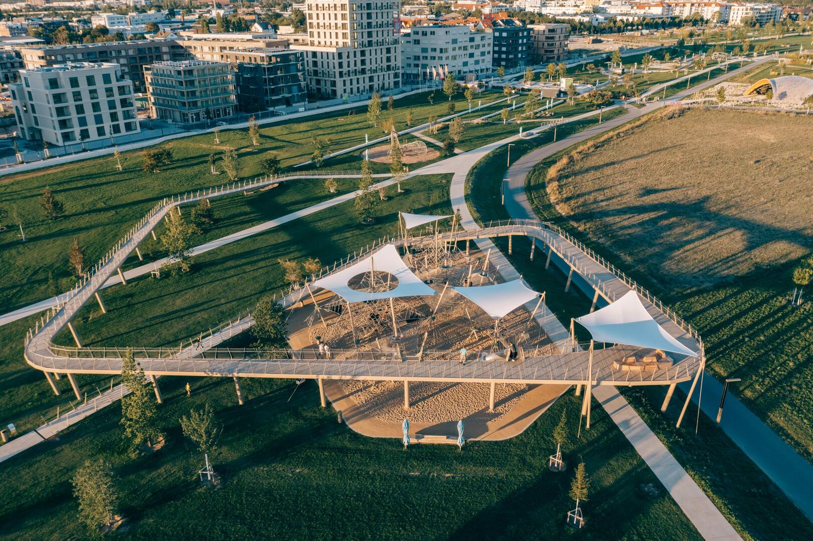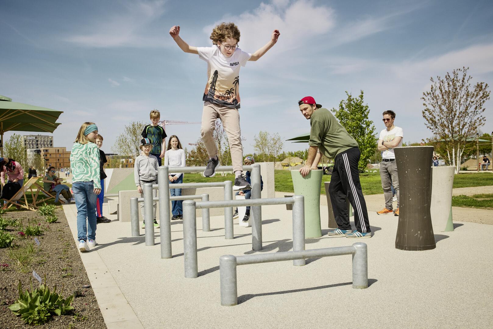 Die Themen der Spielstationen erinnern an Mannheim und seine Erfindungen. Die Spielstation „Vernetzung“ führt Sie auf einen Steg, von dem aus Sie weit über das Spinelli-Gelände sehen können.