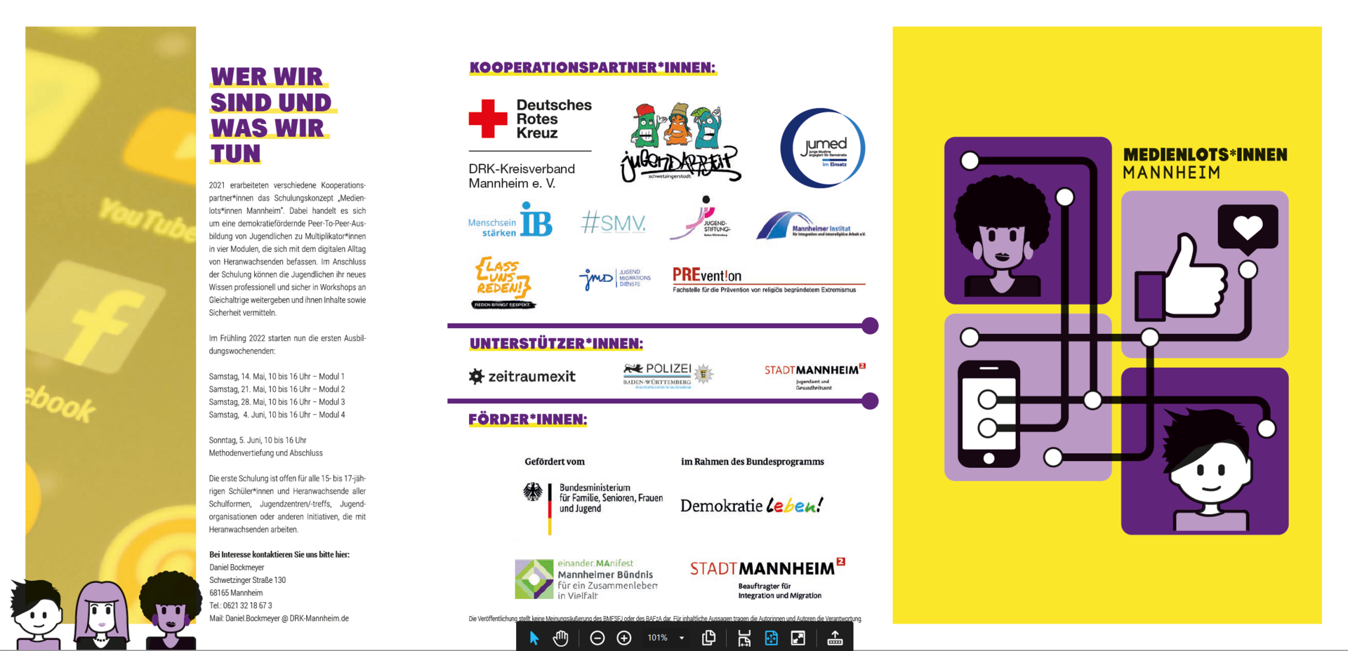 In der ersten Jahreshälfte 2022 findet die Ausbildung der Jugendlichen und jungen Erwachsenen mit den Themenschwerpunkten (1.) Wirkungsmacht von Social-Media, (2.) Hate Speech, Diskriminierung, Rechtsextremismus, (3.) Fake-News, Verschwörungstheorien, Quellenkompetenz und (4.) Cyber-Mobbing statt. Ab der zweiten Jahreshälfte geben die qualifizierten Jugendlichen und jungen Erwachsenen in einem Peer-To-Peer-Setting ihr Wissen als Multiplikator*innen in Schulen, Jugendhäuser, Jugendgruppen oder anderen Einrichtungen weiter. Der DRK Kreisverband Mannheim e.V. setzt das Projekt mit Kooperationspartner*innen unter anderem mit JUMEDiE – Junge Muslime engagiert für Demokratie im Einsatz und der Stadt Mannheim – Offene Jugendarbeit Schwetzingerstadt um. Neben der Schulungsdurchführung werden die Inhalte der Ausbildung hinsichtlich aktueller Trends fortlaufend reflektiert und ggf. weiterentwickelt und angepasst.- einander.Themeninsel Zusammenhalt in der Vielfalt (2022)