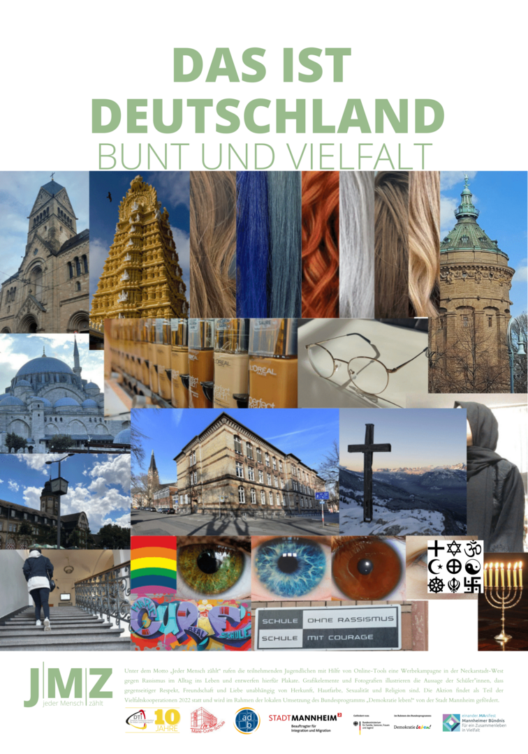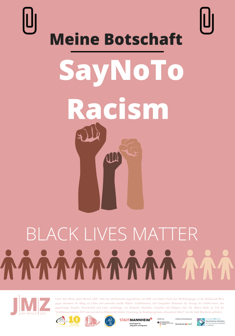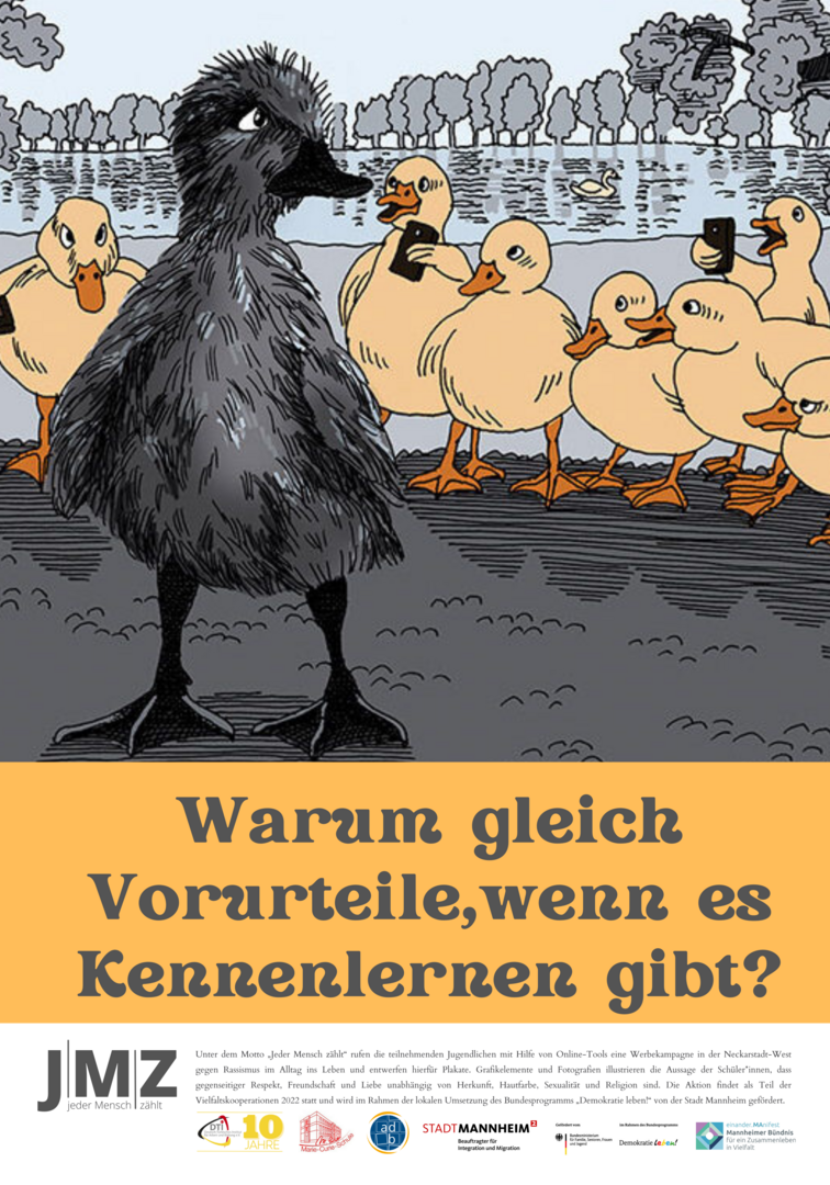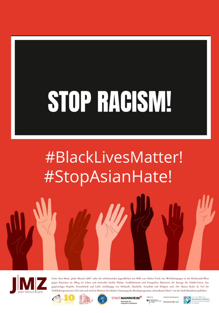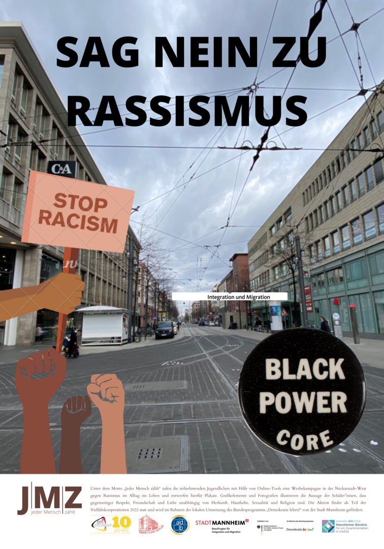 Im Projekt setzen sich Schüler*innen der Marie-Curie-Schule in der Neckarstadt-West kritisch mit Rassismus und Antiziganismus auseinander. Hierzu entwickeln und setzen die genannten Kooperationspartner*innen für die Kulturwochen der Schule im Februar 2022 ein vielfältiges Programm zu den Themen Rassismus und Antiziganismus um. Das Projekt zielt darauf, Schüler*innen frühzeitig für rassifizierte Muster von Diskriminierung zu sensibilisieren und zugleich Unsichtbarkeiten der Geschichte von Sinti und Roma entgegenzuwirken. Zugleich sollen Jugendliche Formate gleichberechtigter, gesellschaftlicher Teilhabe beispielsweise in Jugendverbänden oder in Quartiersstrukturen kennenlernen. Somit stehen zum einen Sensibilisierung und Engagement gegen Diskriminierung, zum anderen die Förderung von jugendlicher Teilhabe und Empowerment vielfältiger jugendlicher Perspektiven im Vordergrund. Im Rahmen des Projekts entwickelten die Schüler*innen eine eigene Plakatkampagne.