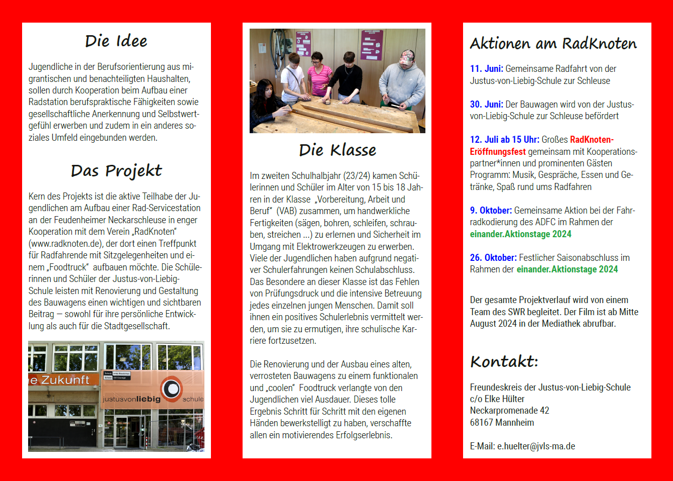 Projektbeschreibung: Der Freundeskreis der Justus-von-Liebig Schule fördert mit dem Kooperationsprojekt „Sozialer Anschluss Radstation“ die gesellschaftliche Teilhabe benachteiligter Jugendlicher. Durch den gemeinsamen Aufbau einer Rad-Servicestation an der Feudenheimer Neckarschleuse werden gleichermaßen Selbstwertgefühl, berufspraktische Fähigkeiten und gesellschaftliche Anerkennung der teilnehmenden Jugendlichen gestärkt. Mit der Radstation wird ein Treffpunkt mit Bänken, Tischen und einem „Food-Truck“ entstehen, zu dessen Gestaltung und Belebung die Schüler*innen der Justus-von-Liebig-Schule einen wichtigen und sichtbaren Beitrag leisten – sowohl für ihre persönliche Entwicklung als auch für die Stadtgesellschaft. In der Zusammenarbeit mit dem Cinema Quadrat wird eine filmische Dokumentation des Projekts produziert.- Medienlots*innen Mannheim 2024