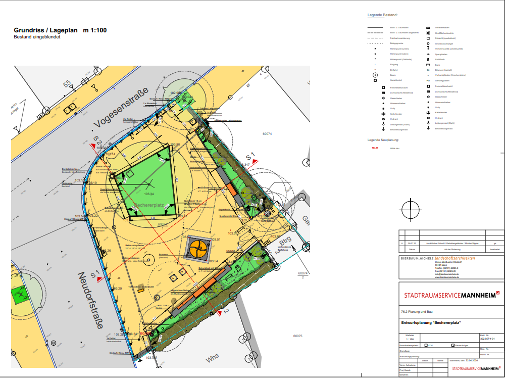 Die städtebauliche Erneuerungsmaßnahme „Friedrichsfeld Zentrum“ wurde mit der Beschlussvorlage V380/2016 vom Gemeinderat in der öffentlichen Sitzung am 20.12.2016 beschlossen und somit als förmliches Sanierungsgebiet festgelegt. Die Durchführung der Maßnahmen wurde eine Frist bis 31.12.2030 festgelegt. Ziel des Sanierungsgebietes ist die Aufwertung des Ortskerns von Friedrichsfeld sowie die Zentrumsqualität des Stadtteils als Wohn- und Gewerbestandort gestärkt werden. Hierzu sollen vor allem Maßnahmen im öffentlichen Raum beitragen. Vorgesehen ist die Neugestaltung von vier Stadtteilplätzen, die mit einem Bürgerbeteiligungsprozess umgesetzt werden sollten. Im Jahr 2015 die Herstellung des Hugenottenplatzes (Goetheplatz) in der öffentlichen Sitzung des Ausschuss für Umwelt und Technik (AUT) vom 29.10.2015 beschlossen und im Dezember 2017 fertiggestellt. Mit dem neuen Bechererplatz soll ein neuer Freiraum kreiert werden, der, statt der vorhandenen, eher introvertierten Anlage, den Besucher und Passanten mit einer offenen, aufgeräumten und einladenden Geste empfängt. Die Platzfläche erhält einen Belag aus Betonpflaster in der Optik eines muschelkalkfarbenen Pflasters und bietet vielfältige Möglichkeiten der Nutzung.