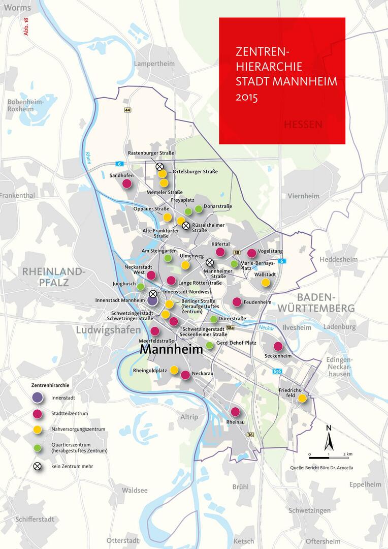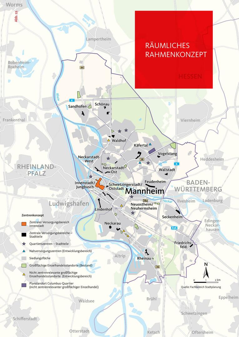 Für das Zentrenkonzept erfolgte u.a. die flächendeckende Erhebung des Einzelhandelsangebotes, eine städtebaulich-funktionale Bestandsaufnahme, die Abgrenzung der Einzelhandelszentren, welche auch zentrale Versorgungsbereiche genannt werden, eine Analyse und Bewertung der Nahversorgungssituation in den Stadtteilen, die Überprüfung der Zentrentypisierung und die Aufstellung einer speziell für Mannheim gültigen Sortimentsliste der zentrenrelevanten und nicht-zentrenrelevanten Sortimente.