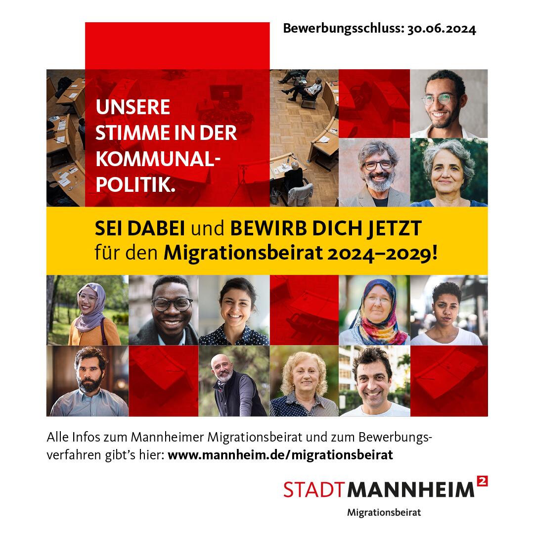 Ende 2024/Anfang 2025 wird der Mannheimer Migrationsbeirat zum vierten Mal neu berufen. Alle Mannheimer*innen mit Migrationsbiografie, die interessiert daran sind, die kommunale Integrationspolitik aktiv mitzugestalten und die dabei ihre spezifischen Erfahrungen und Expertise einbringen möchten, hatten die Möglichkeit, sich vom 1. März bis zum 30. Juni 2024 für die neue Amtszeit 2024-2029 bewerben. Eine eigens hierfür eingesetzte Berufungskommission wird im Herbst über die Zusammensetzung des neuen Migrationsbeirates entscheiden. Das Verfahren wird voraussichtlich Ende des Jahres abgeschlossen sein und der neue Migrationsbeirat im Anschluss vom Gemeinderat offiziell in sein Amt berufen werden. Nähere Informationen zum Berufungsverfahren finden Sie hier.