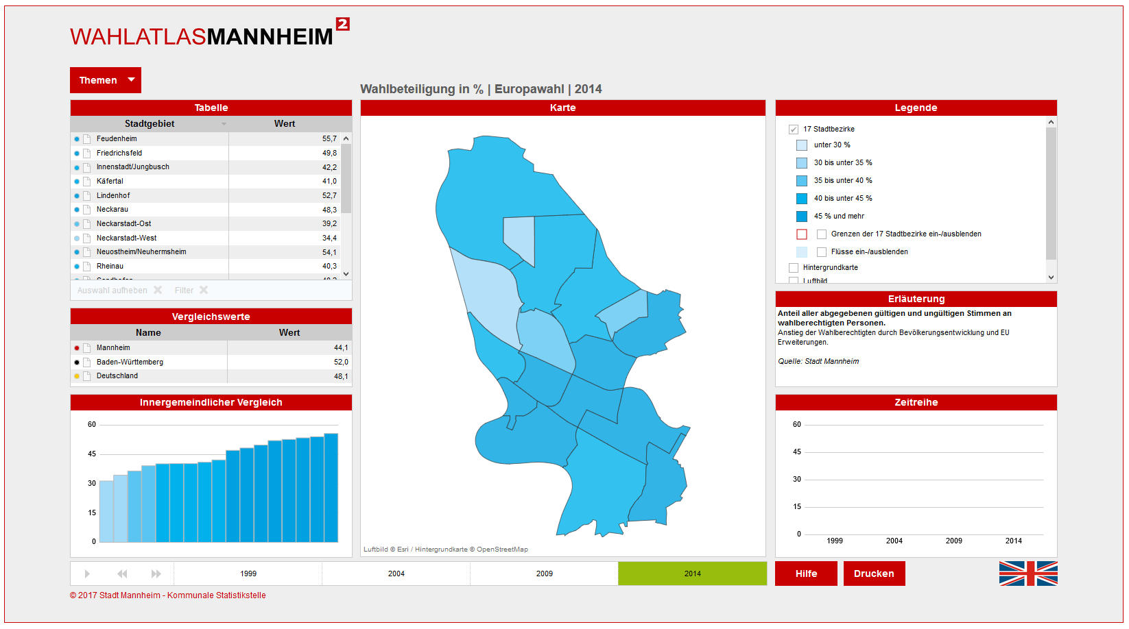 Die Ergebnisse der Mannheimer Wahlen seit 1996 sind nun auch im WahlatlasMannheim2 abrufbar. Dabei bieten sich viele Vergleichs-Möglichkeiten und eine animierte Zeitleiste lässt sogar Entwicklungen deutlich werden. Sie können auch die Ergebnisse der Stadtbezirke, Stadtteile, Wahlgebäude und Wahlbezirke herunterladen. Hier geht es zum WahlatlasMannheim2.