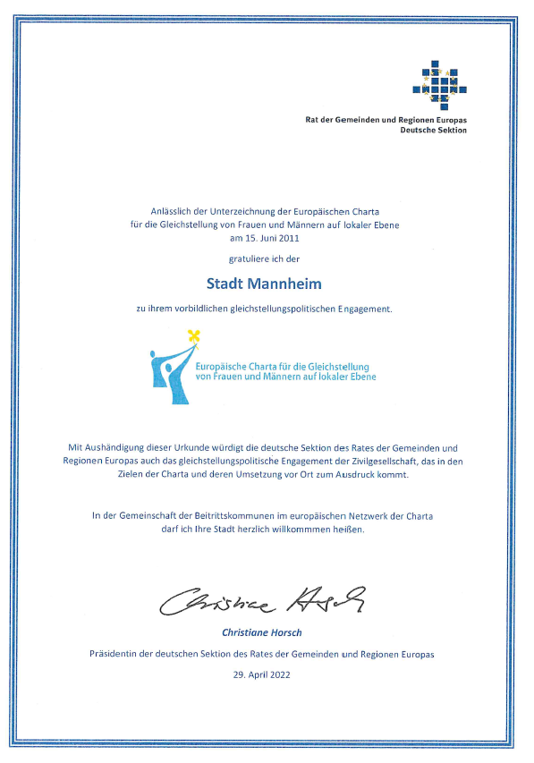 Im Jahr 2006 wurde die "Europäische Charta für die Gleichstellung von Frauen und Männern auf lokaler Ebene" (Charta) vom Rat der Gemeinden und Regionen verabschiedet. Die Charta stellt ein wirksames Instrument zur strukturellen und strategischen Implementierung einer an der Gleichstellung der Geschlechter orientierten Handlungspolitik auf kommunaler Ebene dar. Am 7. Juni 2011 hat der Gemeinderat der Stadt Mannheim einstimmig die Unterzeichnung der Charta beschlossen.