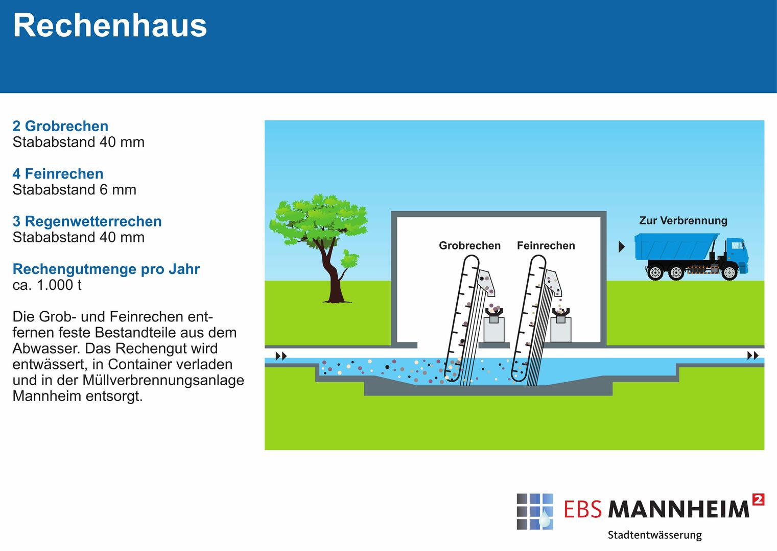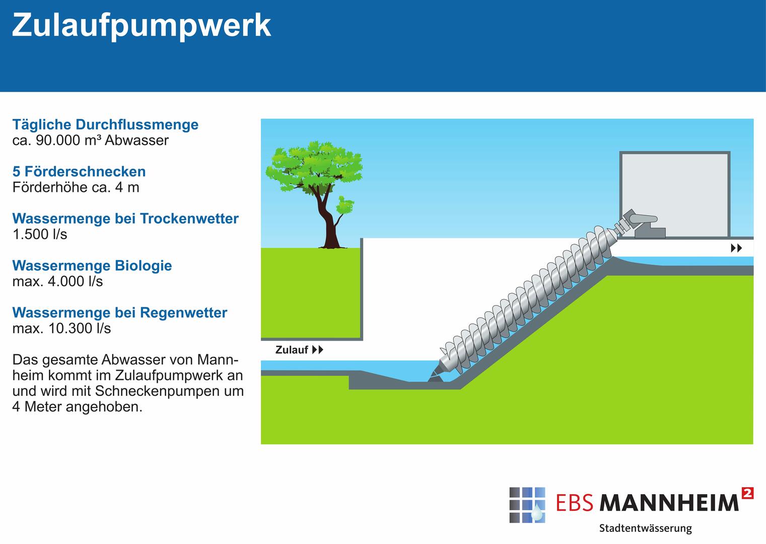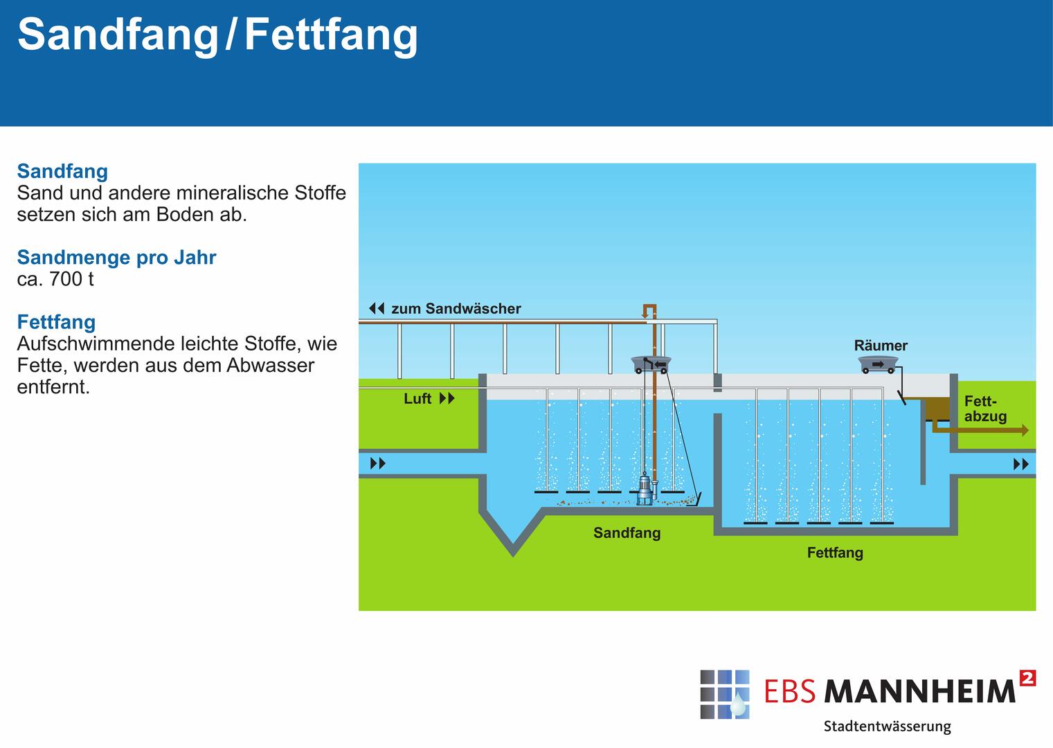 Das zentrale Klärwerk, nördlich von Sandhofen gelegen, reinigt täglich im Durchschnitt 81.000 m³ Abwasser aus Haushalten, Industrie und Gewerbe aus dem gesamten Stadtgebiet. Seine Größe ist auf 725.000 EW (Einwohnerwerte) ausgelegt.